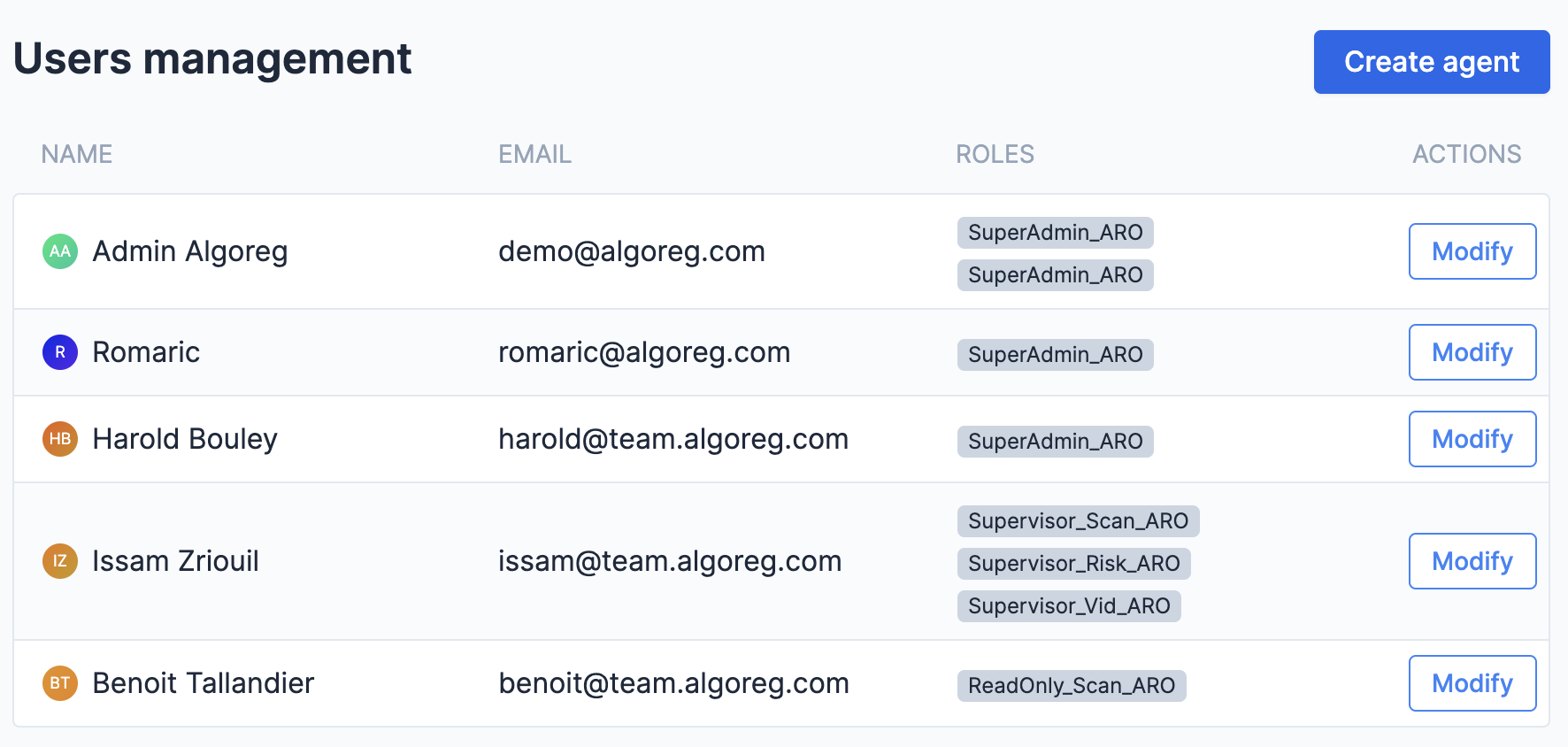 You can add, remove, update users from your Algoreg instance if you have the required access level. To do so, you have to click on the side bar item “Users management”. enc_U2FsdGVkX1+d6xq1OlOWijiNsp20BrQ612bLekqHIDcoKYjwV+w3Qgj0bWAUVAQUVj18OJlrOm6UNwCyYKmczGpMc6p7f9Faw1LB0JZy3Ic=_enc To create a user, click to the right button “Create user” you will be asked to define a name, email and role for this new user.