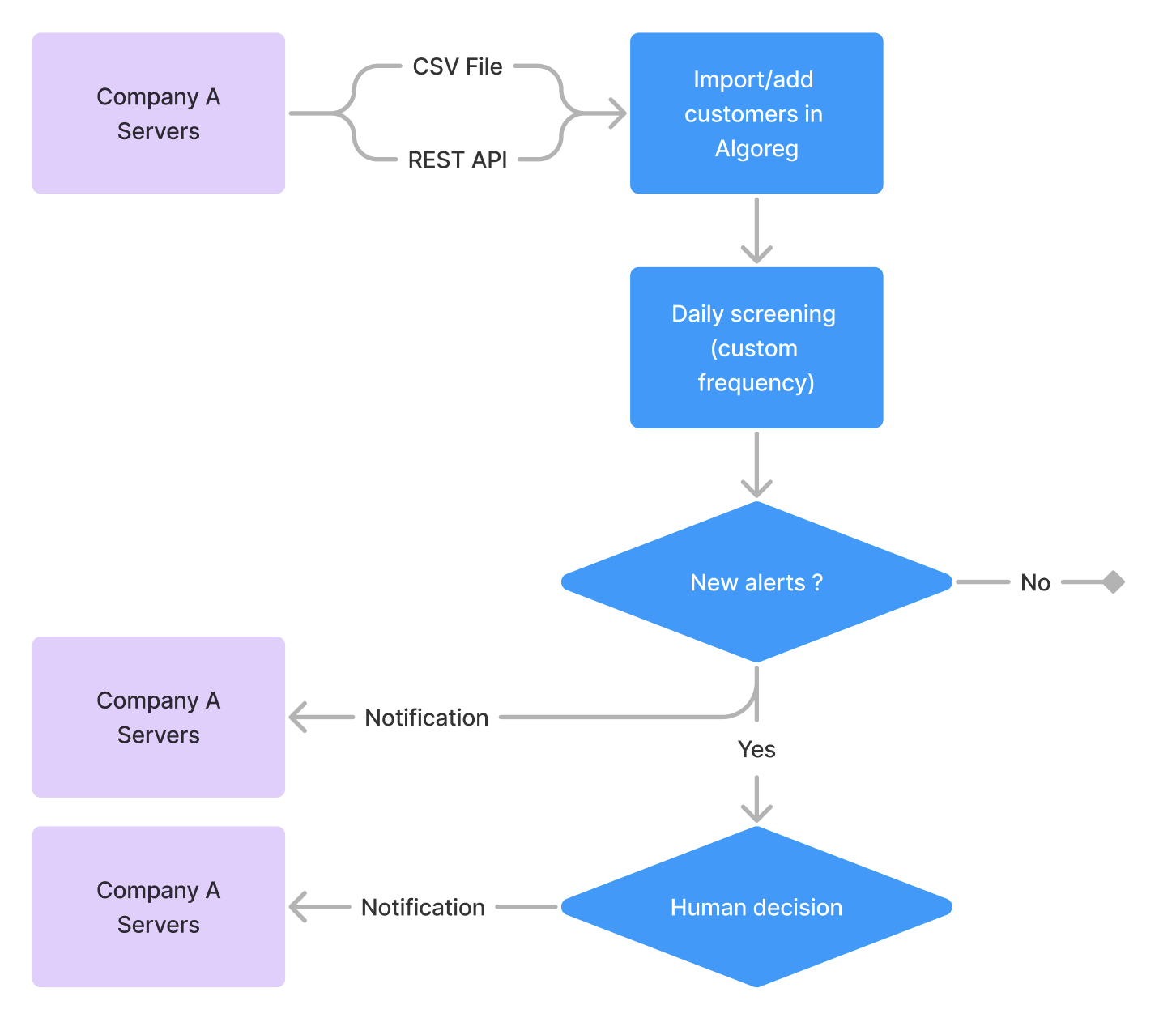 On a daily basis (or custom frequency) Algoreg will scan all your customer database and trigger alerts depending on a configuration called post-filtering. This configuration allows you to exclude some watchlists, specify the matching threshold etc. Jump here for more information Go!Scan post-filtering.enc_U2FsdGVkX1/olvZKsXziJv1tQqKiGBXTuStUXIf1GU8=_enc